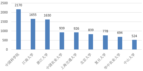 从专利申请数量来看,申请生命科学领域专利的中国机构基本为科研单位和院校,这与国际情况明显不同。公开专利数量前3位的分别是中国科学院(2170件)、江南大学(1655件)、浙江大学(1630件)。专利数量前10位的机构中并没有公司或企业。
