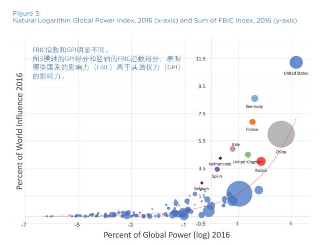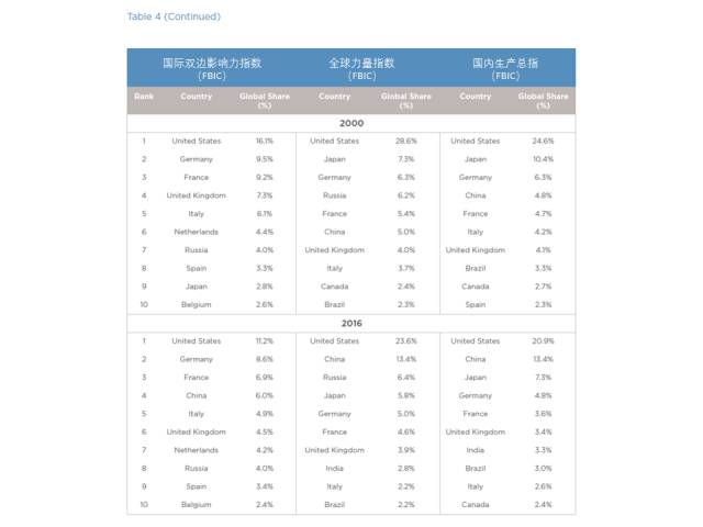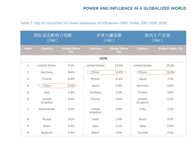 3.美国在全球影响力仍保持全球领先,但其份额一直在下降,而且远远小于其在强制力(GPI)方面的表现。