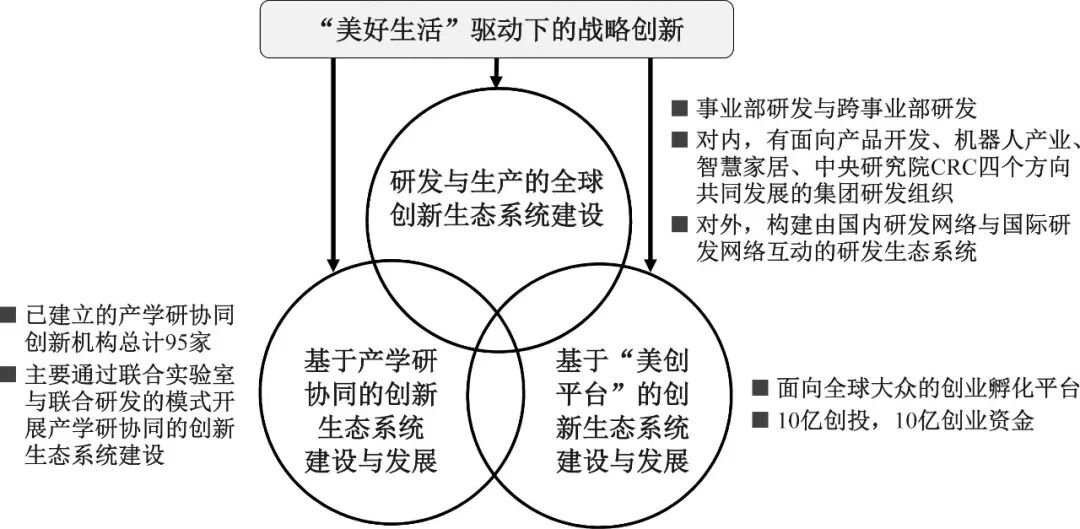 例如,1968年成立于中国广东的美的集团股份有限公司(以下简称“美的集团”),是全球领先的消费电器、暖通空调、机器人与自动化系统、智能物流(供应链)的科技集团。基于核心技术、研发体系等技术要素,美的集团通过强化技术创新管理和战略创新等非技术要素,进一步提升了集团的创新能力。首先,美的集团在战略层面推进集团的战略转型与创新。在国内行业巨头海尔集团、格力电器长期战略跟随的基础上,美的集团于2012年提出“333战略转型”,聚焦于消费者主导的核心能力建设,明确集团的战略定位,即利用约3年做好产品、夯实基础、提升经营质量,利用约3年从家电三强中脱颖而出而成为行业领导者,利用约3年在全球家电行业占有一席之地,实现全球经营。在战略视野的驱动下,美的集团进一步打造研发与生产的全球创新生态系统,建设与发展基于产学研协同的创新生态系统,并打造基于“美创平台”的创新生态系统(如图4所示),从而实现了创新生态系统伙伴和资源的全面汇聚、价值互动和创新溢出,营造了包容性创新文化,大力提升了集团的制造效率、资源利用效率、自动化水平和库存运作优化能力等。整合式创新为美的集团参与全球竞争、构筑在全球家电市场的竞争优势和行业领先地位奠定了基础,其品牌价值得到显著提升[50]。