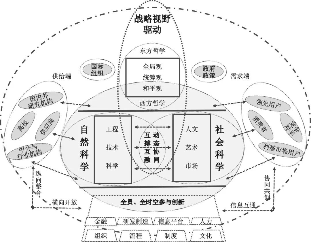 在开放式创新生态系统的时代背景下,整合式创新是整体管理变革下的创新,是东、西方哲学思想引领下基于自然科学和社会科学跨界融合的“三位一体”。整合式创新思想蕴含的全局观、统筹观以及和平观,符合东、西方哲学的核心价值追求,有助于在跨文化的国内外竞争过程中实现工程、技术、科学与人文、艺术以及市场的互搏互融,并突破传统的企业边界,促进企业与外部需求端和供给端甚至国内外的政策端等各创新利益相关主体联合构建合纵连横的创新生态系统,在动态协同中开发市场机会和科技潜力,创新企业产品与技术,通过跨界创新与竞合推动产业变革与区域协同发展,实现“创新为了和平[13]、为了全球可持续发展、为了人的幸福与价值实现”的终极目标。