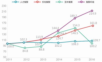 资本集聚指数波动较大,2016年的指数值为100.2,峰值出现在2015年,达到154.3。从具体指标看,天使投资、VC/PE投资额波动性较强,在2016年大幅下滑,影响了集聚力的增长。