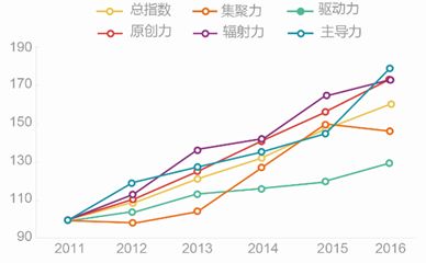 如图4所示,北京2016年的主导力(178.8)、原创力(173.2)、辐射力(172.9)得分高于总指数,集聚力(146.7)和驱动力(129.4)较弱。