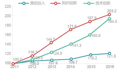 原创投入指数增长较慢,2016年的指数值仅121.8。从具体指标看,基础研究经费占全社会研发经费比重、规上工业新产品开发经费投入占主营业务收入比重两项指标增速都较低。
