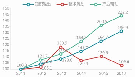 知识溢出指数稳步提升,2016年的指数值为186.9。从具体指标看,国际科技论文被引频次是拉动指数上升的重要动力,年均增速达21.9%。