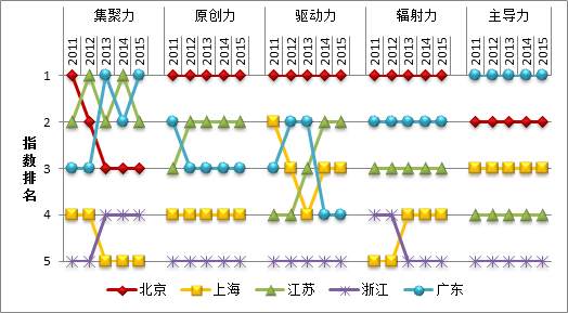 图1 2011—2015年五省市“五力”指数排名变化情况