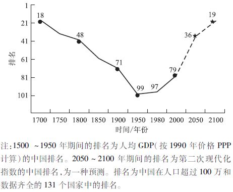 根据经济合作与发展组织经济学家麦迪森的《世界经济千年史》,公元16~18世纪初,中国属于一个经济发达国家,中国人均GDP的排名处于世界前20位以内(第14~18位);19~20世纪,中国属于一个发展中国家,中国人均GDP的排名曾一度下降到世界第100位左右;其中,1820年为第48位,1900年为第71位,1950年为第99位,2000年为第79位(表1)。