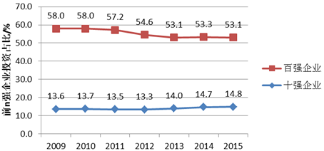 从排名靠前的企业的投资占比来看也是如此。在2009~2015年间,前10强企业的研发投资占到所有上榜企业研发总投资的14%左右。随着时间的推移,这一比例从2009年的13.6%提升到了2015年的14.8%;同时,百强企业的研发投资占比则从2009年的58%下降到了2015年的53.1%(图8)。这一数据充分展示了企业研发投资的汇集情况。