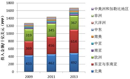 由于统计口径的变化,无法对比2009年前后的变化情况,但从2009、2011、2013这3年的数据(图1、图2)可以看出,各地区的研发投入金额都在逐年增加。其中,东亚与东南亚由于中国的突出表现,4年增幅高达40%,2013年的研发投入金额已经超过北美(4年增幅12%),位居世界首位。加上欧洲(4年增幅13%),这三个地区的研发投入之和占了全球研发总投入的88%,其他地区的研发投入只占12%,其中中亚(包括俄罗斯)占2.5%,南亚(包括印度)占2.7%,大洋洲(包括澳大利亚)占1.5%,非洲(包括南非)占0.8%,南美洲(包括巴西)占2.4%,中东地区占2.0%,中美洲和加勒比地区则不到0.1%。