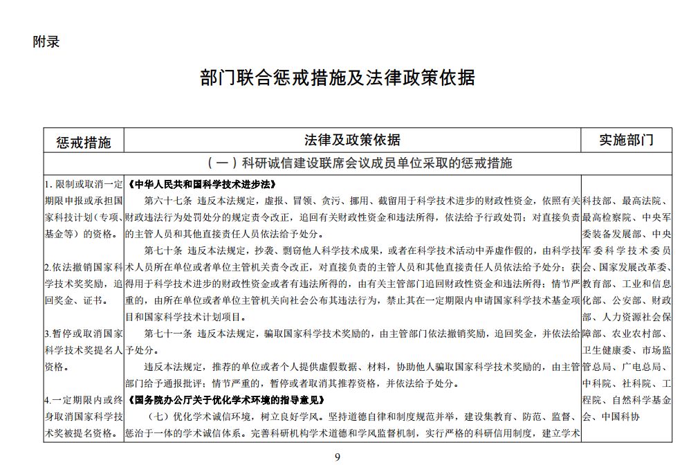 9. 撤销学会领导职务,取消会员资格。 (实施单位:科技部、最高法院、最高检察院、中央军委装备发 展部、中央军委科学技术委员会、国家发展改革委、教育部、工业和 信息化部、公安部、财政部、人力资源社会保障部、农业农村部、卫 生健康委、市场监管总局、广电总局、中科院、社科院、工程院、自 然科学基金会、中国科协)