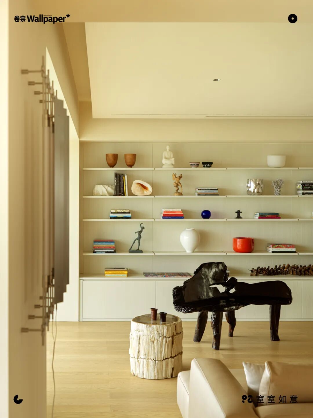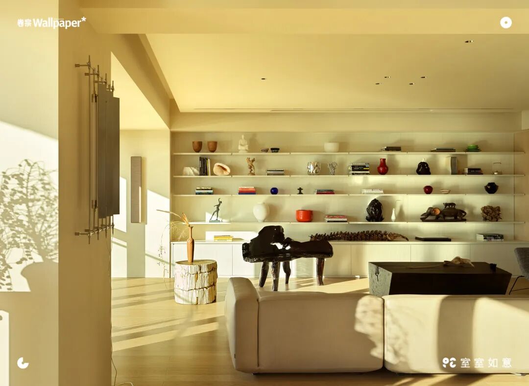 上图:客厅内一整面墙都被蒋晟用来放置自己的收藏