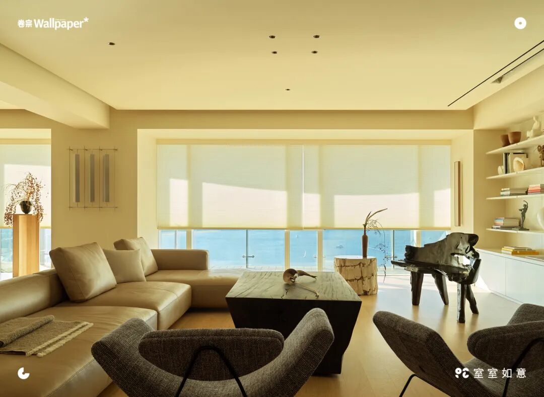 推门进入,一个没有任何遮挡的通透敞亮的大空间,即使热,阳台的门也被全部打开,任凭湿热海风吹遍家里每一个角落。这是蒋晟家的客厅,与餐厅相连,中间没有隔断,米白墙面、橡木地板,一切元素仿佛都在给自然让步,简单明了却充满气场。面向海景的阳台很像传统庭院建筑中的连廊,同样没有阻碍,串联起书房、餐厅、客厅和主卧。