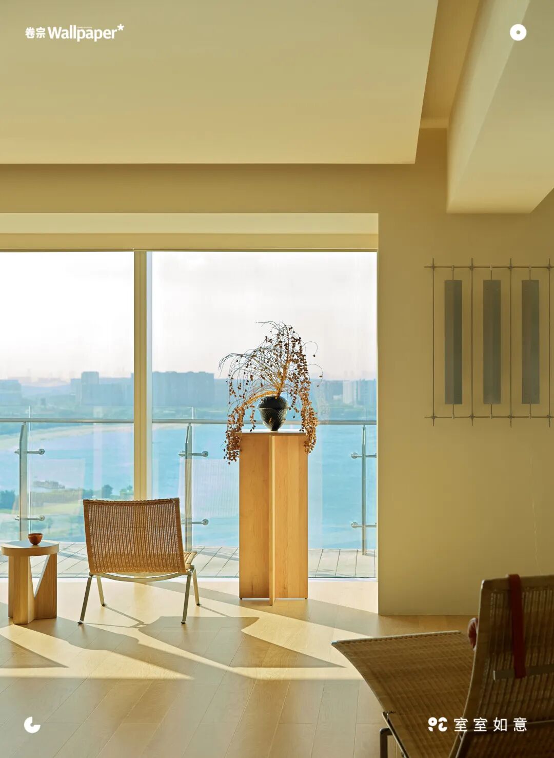 客厅面向落地窗的一侧并列摆放的是两把PK22柳编椅,由Fritz Hansen出品。客厅的落地窗打开,海风灌入,仿佛是整个房间在大口大口的呼吸