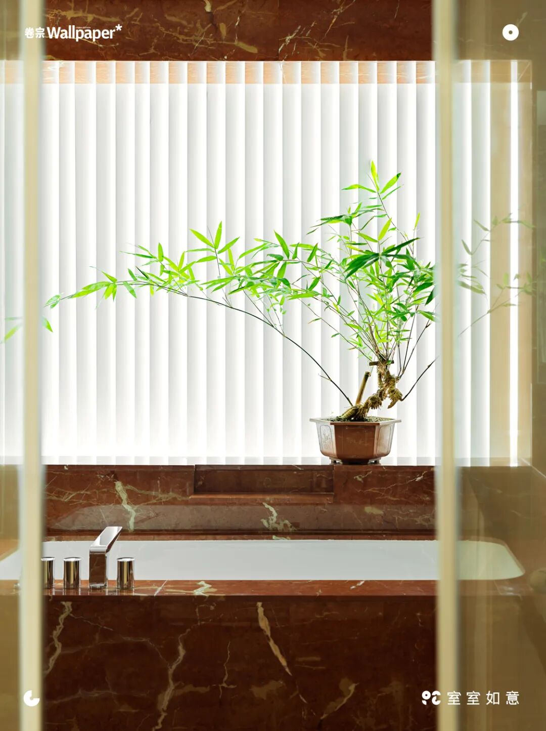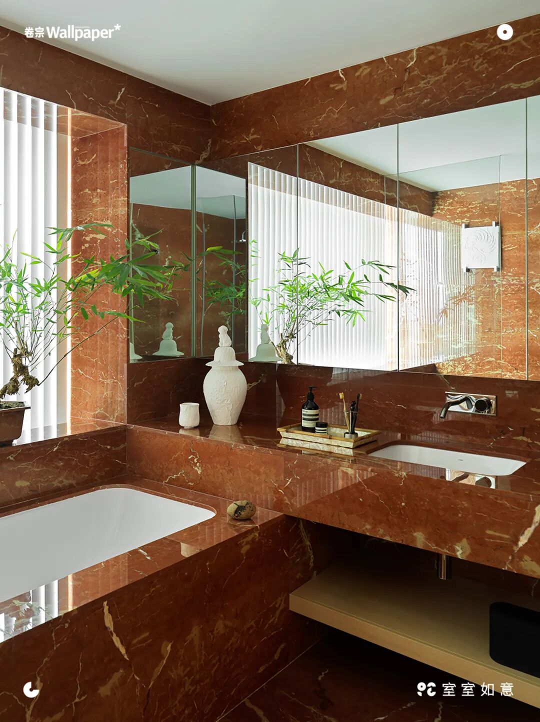 浴室整体用了红色石灰华,是整个空间中最鲜艳的色块,但依然固守着天然材料的原则