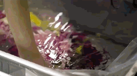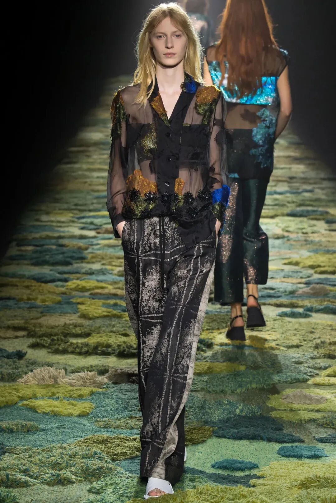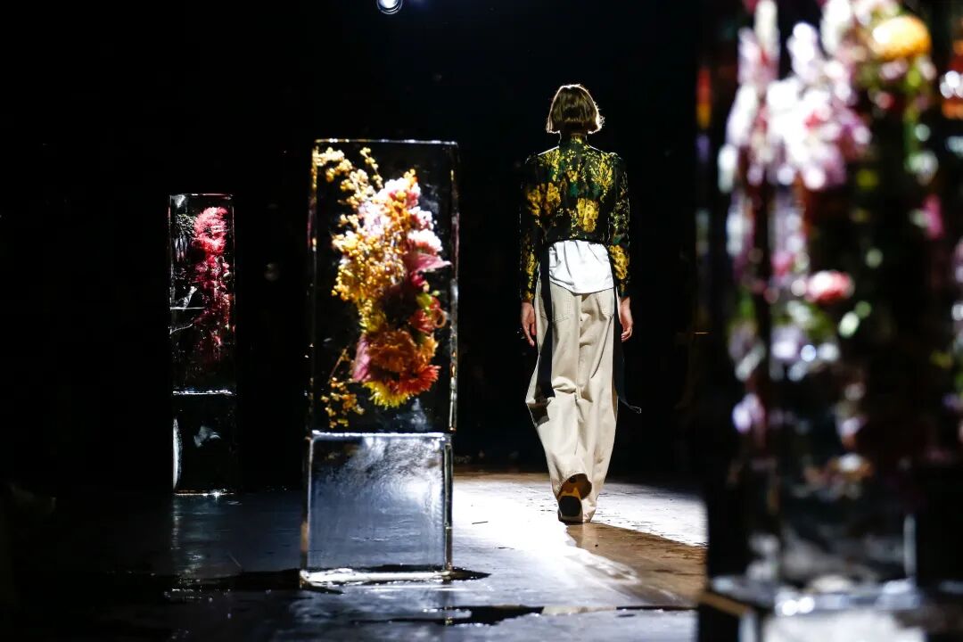 Dries Van Noten 2017春夏秀场装置出自日本花卉艺术家、植物雕塑家Azuma Makoto之手。2016年9月初艺术家团队于荷兰采购鲜花,在比利时工厂捆扎成束后,将花束浸泡于大型冰块模具中冷冻后二次修整,于9月底运输至巴黎Dries Van Noten 2017春夏发布会场地。鲜花、冰共同指向了一种易逝的、脆弱的、临界的意象,为这场发布会制造了唯美的紧张感。