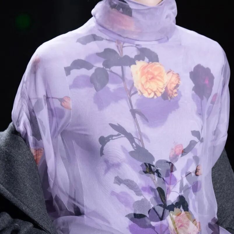 鲜花连同自身在背景布上落下的阴影变成为印花的一部分,它们被转译到时装之上后,构成了细腻的明暗关系表达,因此这一季的作品独具一种古典、柔和的油画质感。