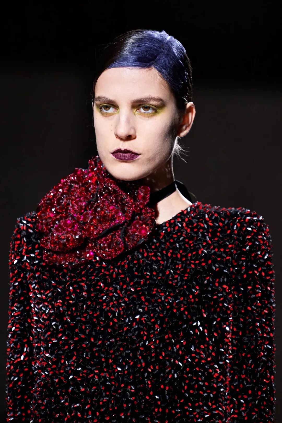 2021秋冬系列,以一场别开生面的现代舞串联起76个造型。强调核心控制的现代舞与Van Noten一直叙述的“内部观念”暗合,更将时装秀中的线性叙事变得更加显著。此外,在模特与舞者们大幅度的肢体动作下每一颗珠片每一缕流苏、乃至每一处丝绒的褶皱皆被追光灯注入生机,而在此般大开大合的表演中衣物始终追随着人们的身体,功能与造型的兼备在此处得到强调。