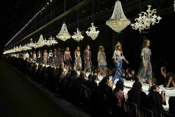 Dries Van Noten 2005春夏系列,是设计师Van Noten的第五十场时装发布会,规模庞大的水晶吊灯形成队列,照亮了被置于来宾餐桌上的天桥,将古典戏剧与流动的盛宴两种语义叠加,造就了辉煌的张力。