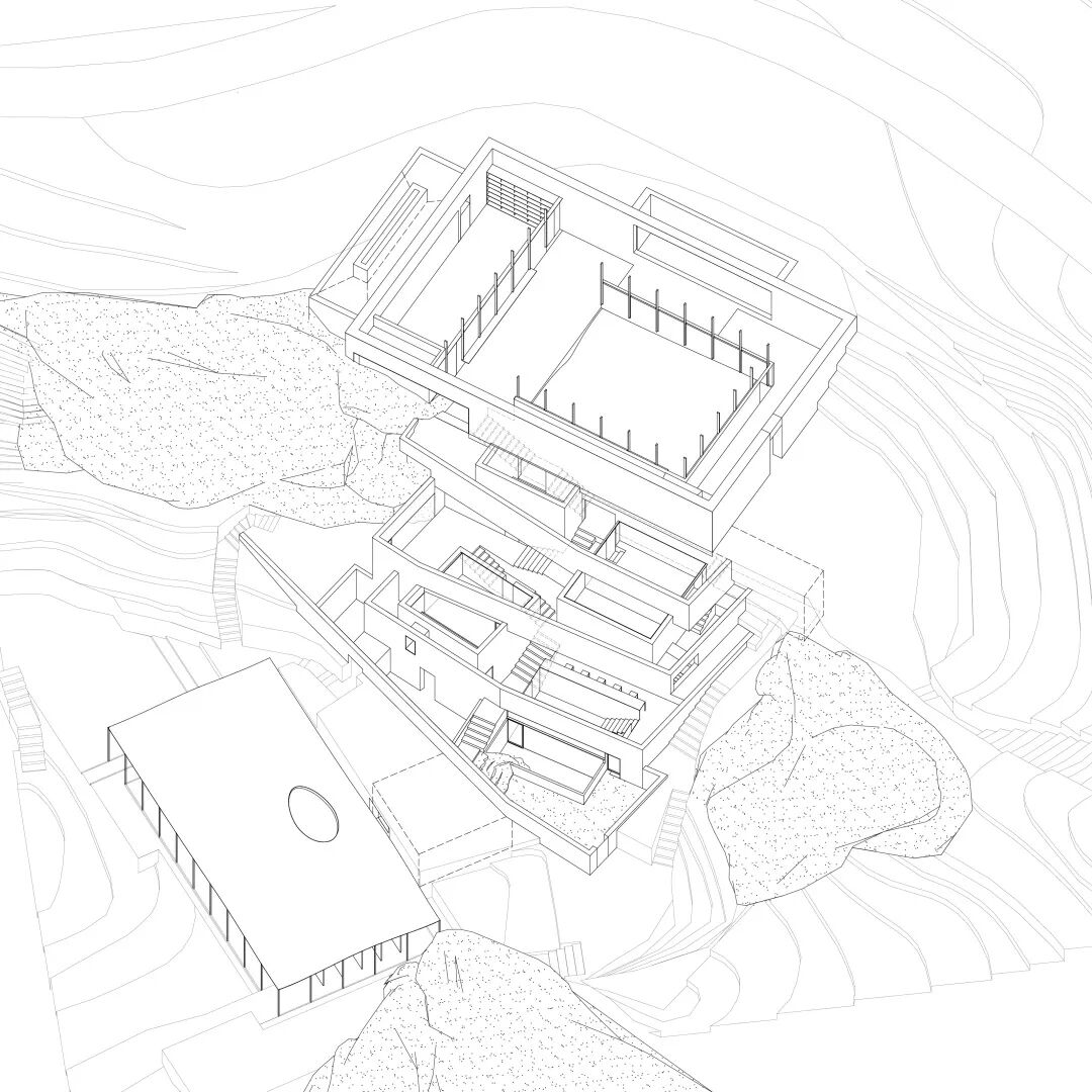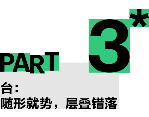 当从远处看向建筑,人们几乎很难分辨层层退后、层层叠落的究竟是完整的一层还是打散的半层空间,只是本能感知对比梯田高差的大尺度,“台”的设计既关照了原初的地形,也关照了建筑使用空间的需要;消解了建筑原本大块有压迫感的体积,也真正做到与环境产生积极的连结。