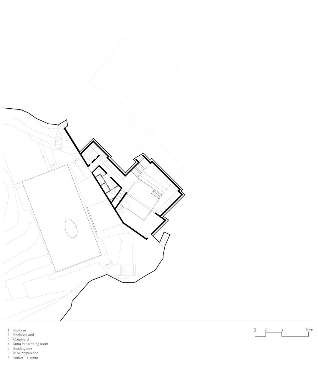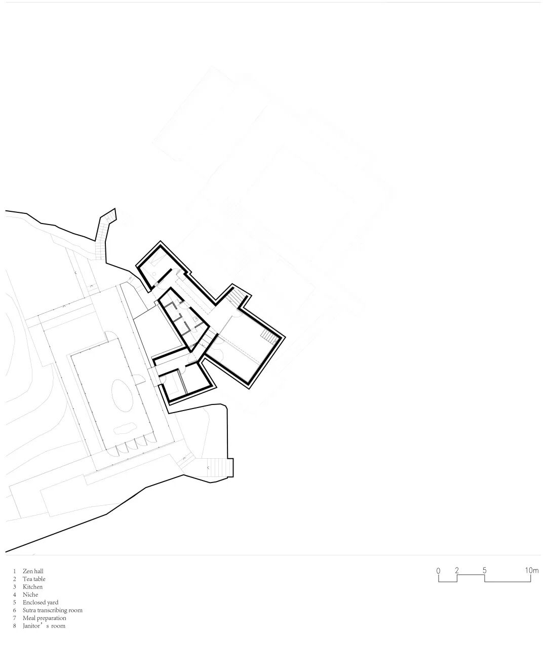 考虑到中国人喜欢向南而居的传统,虽然整体建筑布局朝西,设计在“上院”的部分刻意做了朝南的主入口,在廊院的北侧恰好是佛堂,佛堂内的佛像也得以向南而坐,从而又形成了一道南北向的轴线。建筑中段“台”的内部设有冥想室、抄经室、用餐和读书室等众多功能,特别在读书室中拣选了在禅宗思想影响下中国思想史及建筑史的书籍,让场域整体氤氲在禅意的文化氛围中。