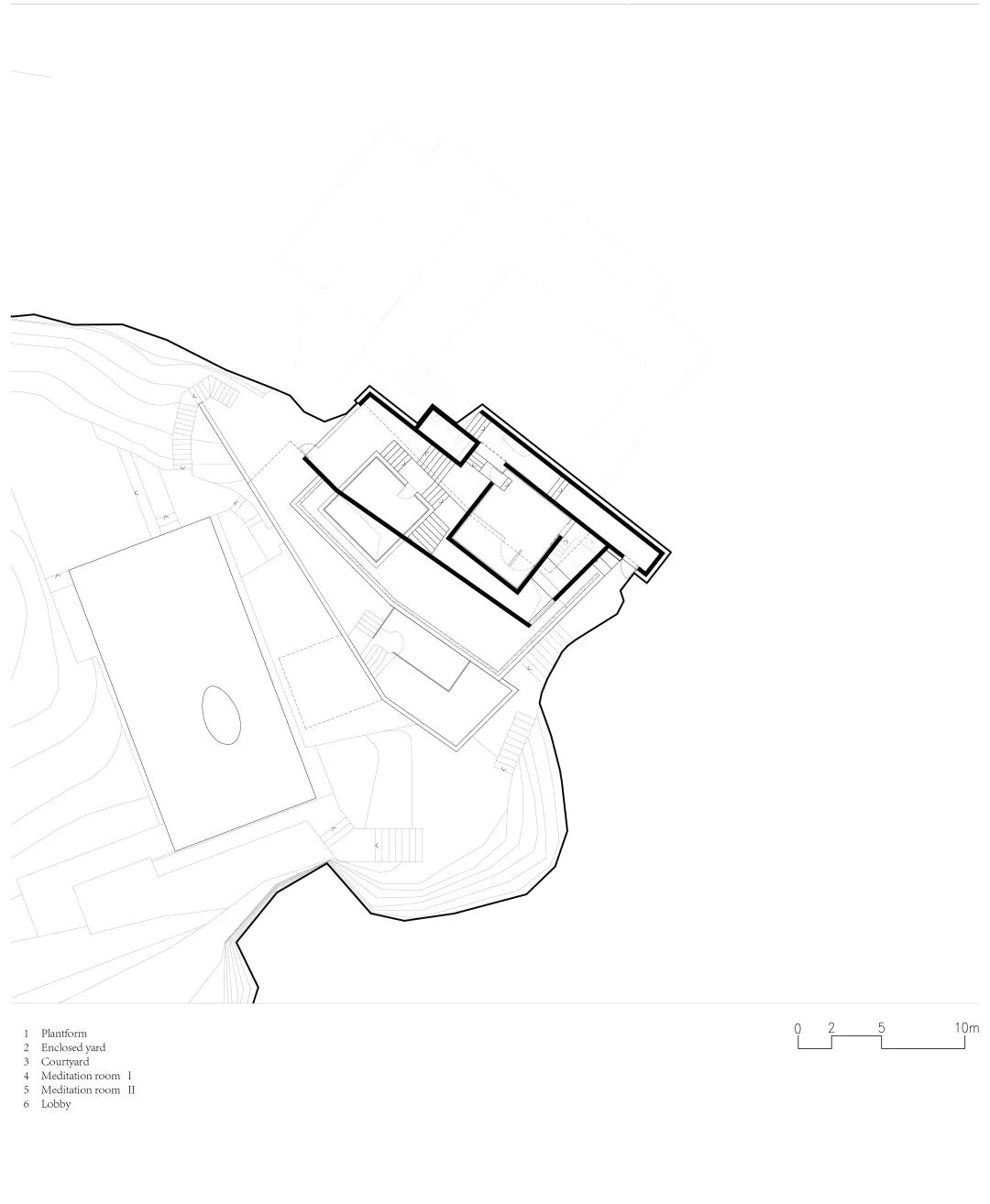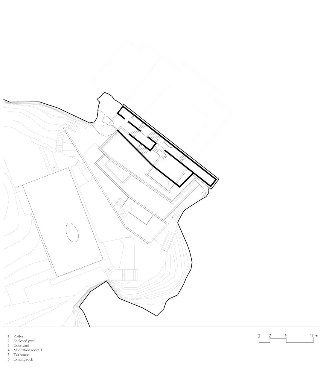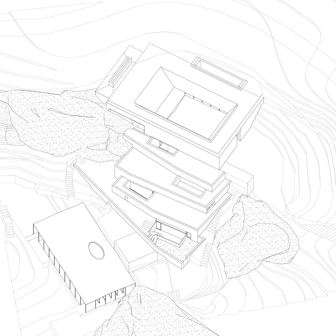 最上方的院和最下方的禅堂形式在设计之初就已经明确,但作为中间连接的“台”应该怎样做让设计师颇费一番心思。按照原本的地形,如果直接在每一层梯田产生的平面作为层台,则每层之间的高差约3-4米,这样既不会有太多的退台,这个尺度对比山中台地整体的体积也是偏大且不协调的。