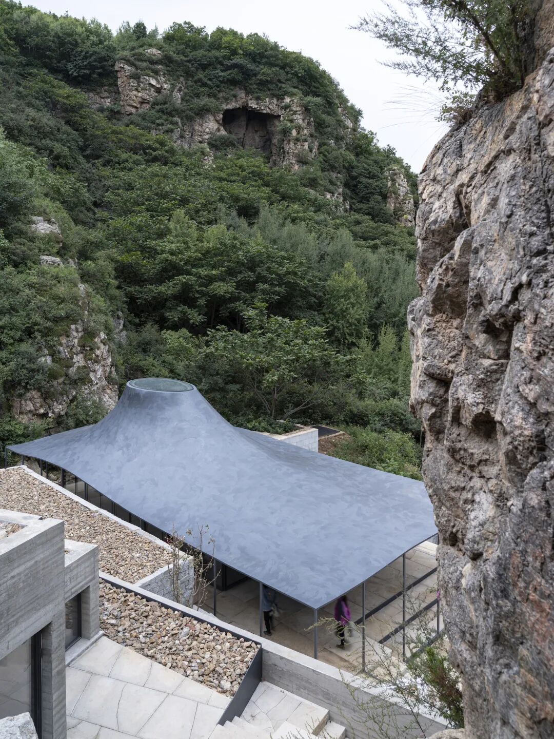 在项目之初,上院原本选址在山岭的高点,但当设计团队开始一稿方案设计后,却始终感觉位置不够隐蔽妥当,似乎与人们脑海中“深山古寺”稍显神秘而不易寻的一贯印象不符。环顾四周,在稍向下的位置正巧有两块断崖,其中间“挤”出了一块平坦的土地。这在设计师眼中便是选址佳处了,建筑与山体的关系无疑会更加密切,同时也让设计充满更多可能性:例如禅堂尽可以做得通透无形,因为周边的山体崖壁可以作为建筑天然的围护结构,人作与天工相交织,让建筑仿佛是从山中生长出的一样。