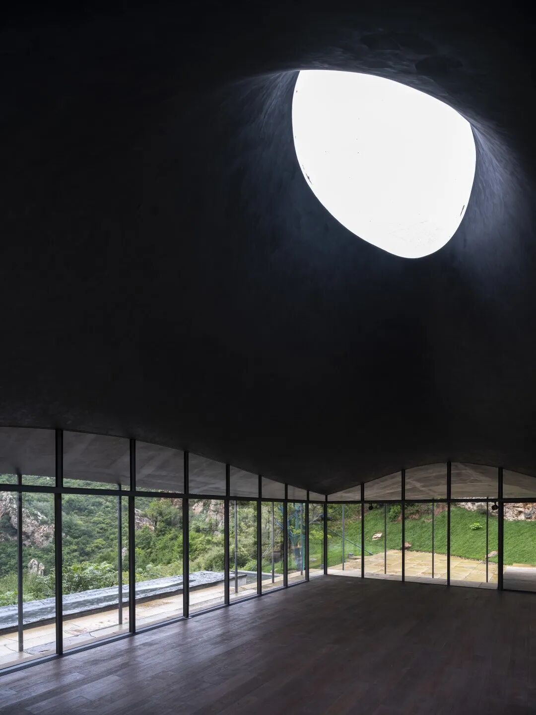 从空中向下看,禅堂的第五立面是规整的矩形,与其上方的“院”、“台”相呼应;但从侧面看屋檐则是流畅的、有细微变化的曲线。设计在这里依然想表达中国传统屋顶的意蕴,但又不真确做成庑殿顶或歇山顶,而是用现代的手法和似是而非的形态转译传统的建筑情绪,那是洒脱俊逸,向往天空的恣意感受。