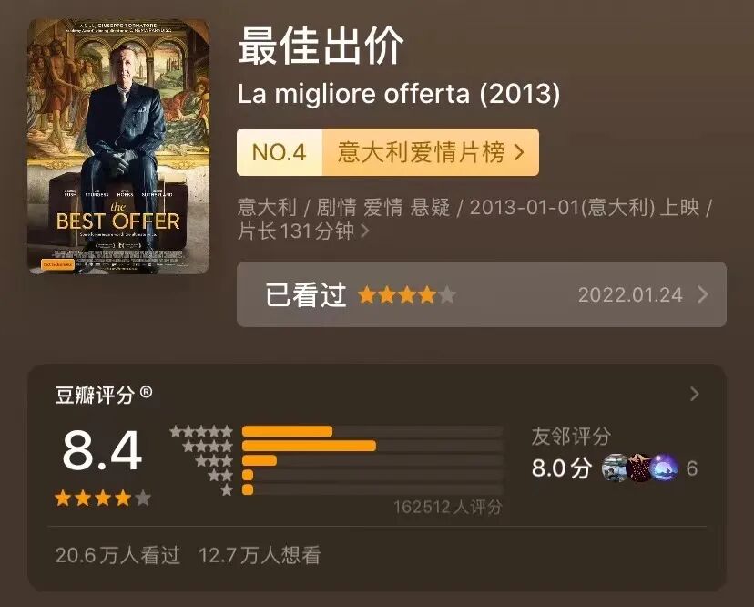 豆瓣评分7.5,我保持一致。原来这部电影设定在哈尔滨!处处可见熟悉的建筑和街道风格,还有「仓买」,还有「黑A」,那种生猛凛冽的画风,确实很东北。一部犯罪片,不剧透啦~豆瓣评分7.9,我的评分7.5。这这这这这,更童话了。女主角迷恋一个从未见过面、只听过一次声音的丧妻男士,背叛未婚夫跨越美国去找他;男主角沉浸在丧妻之痛中一年半,然后对女主角一见钟情。咳,大学时候看,我肯定感动死了。啊!这就是爱情!然鹅,爱情片总是以牵手结束,生活却是从牵手才开始的。