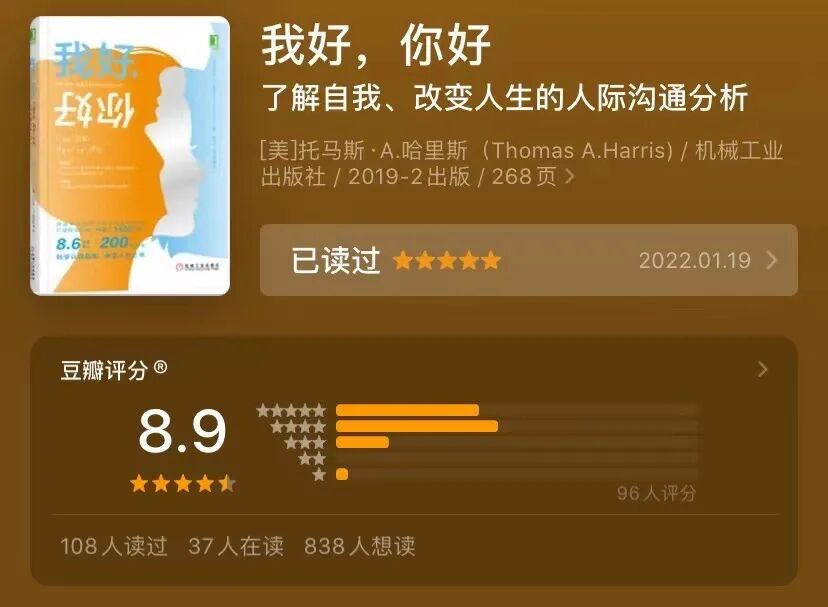 《我好,你好》真的超棒,是这个月读的书中,对我启发最大的一本,超级有帮助。它指出,每个人的人格由父母、儿童、成人三个维度组成。当然,这只是作者用来分析问题、解决问题的方法,不代表我们就是这样的。「父母」人格是指,小时候,父母灌输给我们的观念和思维,在我们身上被内化;「儿童」人格由父母的教育塑造而成;而「成人」人格,是独立思考之后得出的自我意识。作者说,「父母」人格总在讲“你看,你不好”,颐指气使;「儿童」人格总在讲“你看,我不好”,弱小无助。我的感觉是,「父母」总在指责,而「儿童」总在抱怨,他们都为情绪所操控,沉溺于其中,而「成人」往往专注于眼下的现实问题,去思考有意义的解决方案。啊!有了这个模型,当我们在生活中遇到事情时,就可以立刻有非常具象的觉知:-我现在是用哪个人格应对事情?是「父母」吗?是「儿童」吗?-这两个人格是过去留下的痕迹。我可以相信我自己,使用「成人」人格,更理性更智慧地去解决问题。