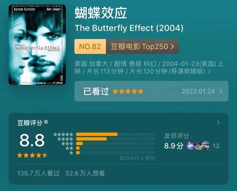 《蝴蝶效应》真的很好看!!不然我也不会拉着朋友重看了~男主角发现自己可以回到过去,于是每当他得知自己所爱的人过得不好时,他便选择重回关键的时间节点,改变事件的走向。正如篇名「蝴蝶效应」所预示的那样,牵一发而动全身,男主角始终找不到一个十全十美的解决方案,无论哪条道路,总会有人陷入不幸。最后,他选择……
