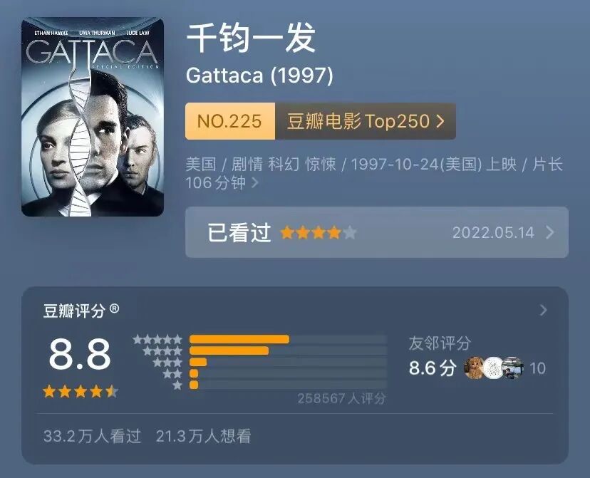 在未来世界,人类可以通过科技干预,来决定新生儿的基因。医生们帮助父母生下他们能够生下的最优秀的孩子,这个孩子长寿、运动能力强、不会有各种疾病隐患,被称为“基因优化人”。新的歧视就此产生,种族、肤色、国别都不再重要,拥有种种基因缺陷的自然人,站在了鄙视链的底层,他们不再拥有任何可能性和机会。电影就在这样的设定下展开,讲述了自然人文森特抗争命运、实现梦想的故事。好看的!05