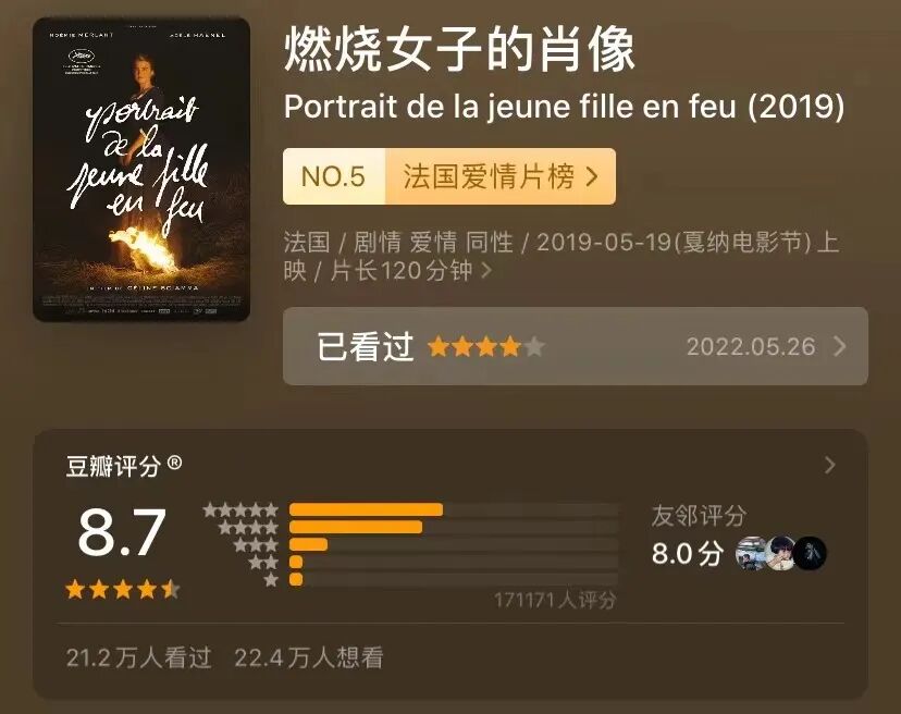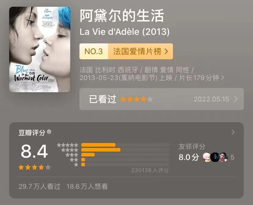 。哈哈哈,别问了,我直的。阿黛尔和艾玛的家庭和成长背景完全不同,两人的思想层次和精神世界大相径庭,“可以一见钟情,但无法长相厮守。”(豆友@了不起的花轮君)