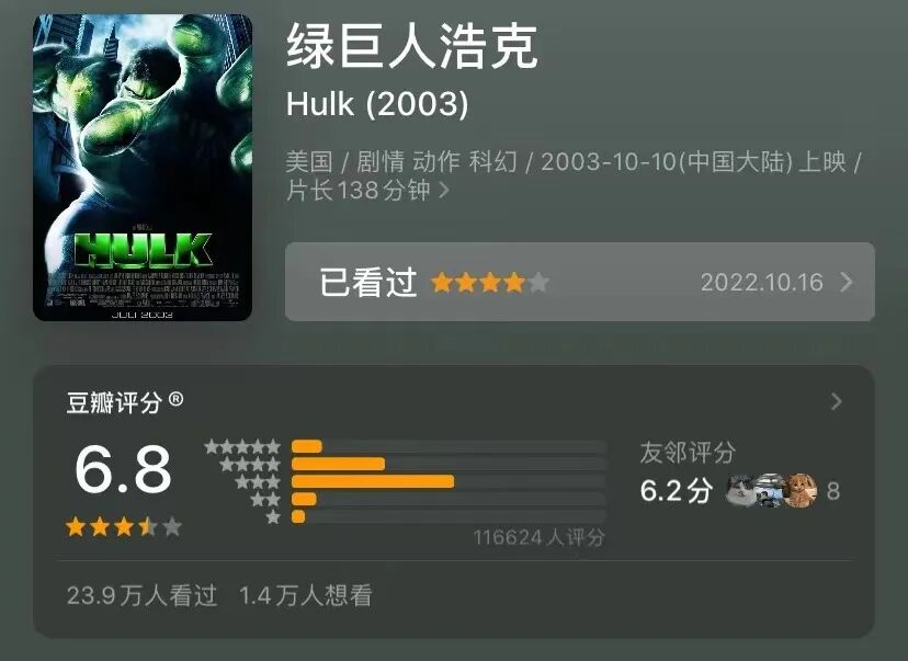 不是说这个评分就权威哈,只是做个参考。大家都说李安不适合这种超级英雄片,“李安的细腻确实不适合这种不需要脑子的电影”(@Weizhi Pan™)。