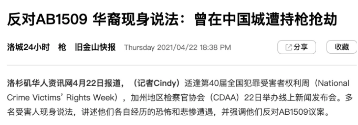 “AB1509 的目的是减轻对枪支犯罪者加重判决,这样的量刑造成对犯罪者,特别是大比例的有色人种罪犯的同一个罪行进行重复处罚,却没有促进公共安全。减少使用加刑重判并不是说不进行处罚,罪犯仍要为所犯罪行服满整个法定刑期。减少加刑的目的只是为了缩短加刑重判的极端量刑长度。”“这项法案是关于废除我们在量刑中已造成过分监禁的系统性种族主义,” 李天明说,“当我们考虑安全和预防时,似乎应该对枪支交易进行普遍的背景调查,确保枪支不会落入坏人手中,并提高人们的社会经济地位,这样暴力首先就不会发生。”“如果目标是建立更安全的社区,那么超长刑期已被证明与这一目标背道而驰,监禁一个人每年要花费国家超过 11 万美元,当我们观察来自《亚裔美国人推进司法》的数据时,会发现有 97.7%的获释人员不会犯下新的罪行,这与许多人的误会相去甚远。” 李在公开信中表示。相反,州政府可以投入资源帮助他们重返社会,并为他们提供服务,以帮助他们回归正常生活、减少贫穷、加强社区和消除如饥饿和不安全居住环境等犯罪根源。最近华裔简体中文出现了反对AB1509的声音,我们从不否认亚裔在美国是司法体系的受害者,更时常是犯罪中的受害者,而在我们的社会中,已经有四十年的经验告诉我们,预防犯罪,把钱花在孩子身上让他们健康成长,远比惩治犯罪更有意义。另外值得一提的是,上图中的“加州地区检察官协会”曾被The Appeal的调查记者Jerry Iannelli查出曾从环保起诉中挪用了三百万美元以游说反对刑事司法改革,CDAA非学术/研究机构,实际更像政治团体,我们在这里想说的是,不希望这场关于司法体系的讨论变成政治纠葛,大家不如自己去看看公示的AB1509,也欢迎读者们去听听不同意见。而关于文章中的担心,AB1509法案在政府公示中明确指出,并不适用于所有法定罪行,也不适用于:•以造成严重人身伤害或死亡为目的的,团伙参与的自车辆上的射击提出法案的90后立法者李天明再次表示:“我们寻求大规模劳动和教育,而不是大规模监禁。我们必须投资于促进恢复性正义和愈合的解决方案,而不是非人化。国家政策必须建立在基层领导,和那些直接受到大规模监禁和递解出境影响的人之上。我们必须在地方、国家和国际层面上与亚裔团体和其他有色人种社区建立联盟。”