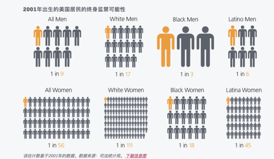 2005年,最终加州假释委员会在亚裔美国人团体和美国名人带动下,提前释放了被消耗了20年人生的郑小飞,但是绝大多数有色人种,没有郑小飞如此幸运。有色人种和司法系统的纠缠不会中断。在2001年出生的黑人男性中,每三个人中就有一个会在他们一生中某个时候入狱;每六个拉丁裔男性中就有一个会有同样的命运,非裔美国人被逮捕的可能性比白人高2.5倍。就算很多有色人种孩子被释放,他们在学校继续面临更严厉的惩罚。2010年的一项研究发现,超过70%的 "涉及与学校有关的逮捕或移交给执法部门 "的学生是黑人或拉丁裔,黑人学生被停学或开除的可能性比白人学生高三倍。![]()