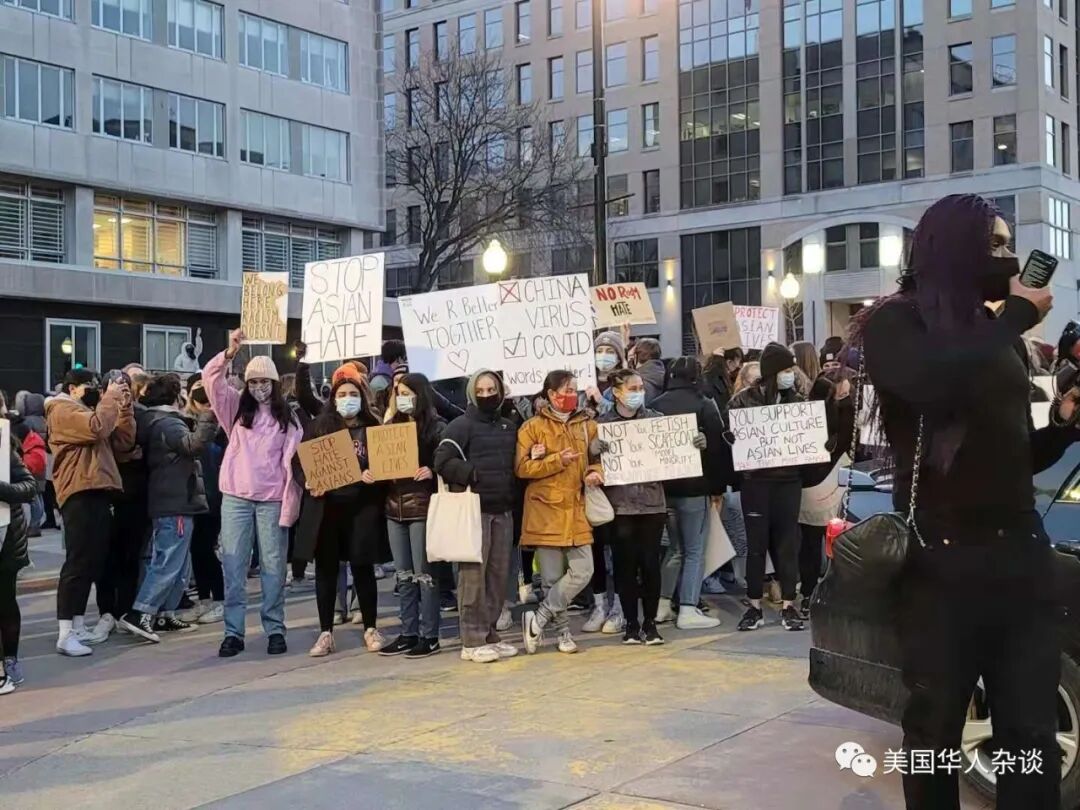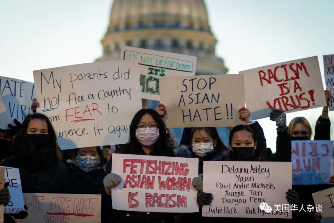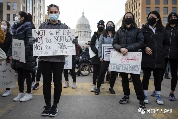 他在讲到这里时,非常自豪的告诉我,这是他第一次真正的参与游行,也是第一次把自己的名字放在了联名信上。我对Basal有很多好奇,但是我想知道他能如此积极的为亚裔发声,是不是通过朋友甚至亲人对亚裔有更多的了解,因此希望保护他们免受伤害。Basal告诉我,他本人有几位位亚裔朋友,其中一位甚至邀请他去过他家和父母一起吃完饭,让他也有机会浅浅地了解到真正的亚裔文化以及生活。但是他不否认,在拥有这些朋友之前,他对亚裔的了解也仅是来源于媒体,和在去美甲店时与的几位亚裔店员的短暂接触。和很多活动者一样,他在亚特兰大事件发生后被瞬间点醒。认识到了事件的严重性,他开始查看过资料。毕竟,我们都知道冰冻三尺,非一日之寒。通过自己“补课”,Basal了解到了许多令人震惊的事实和历史。现场照片,中间的标语上写着:(亚裔女性)不是你的癖好,(亚裔)不是你的“模范种族”,图源:Madison365