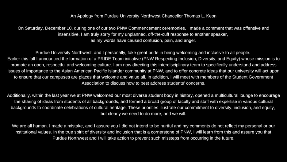 “我发表了令人反感和麻木不仁的评论。对于我对另一位演讲者意外、即兴的回应,我深表歉意,因为我的话已经引起了困惑、痛苦和愤怒…我向你保证,我无意伤害他人,我的评论并不反映我个人或我们学校的价值观。本着作为普渡西北分校基石的多样性和包容性的真正精神,我将从中吸取教训,并向你们保证,普渡西北分校和我将采取行动,防止未来发生此类失误。”