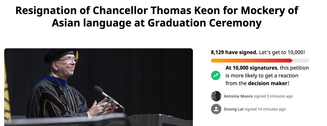 各方反应不一:校董会选择原谅、教职工和学生呼吁他下台校董事会迅速了接受了他的致歉信。但是,他对亚洲人的嘲讽行径迅速在教职员工和公众中发酵。一个自称为普渡西北分校的学生在change.org上发起了签名,要求科恩辞职。到今天为止,大概收到到了8000份左右的签名(Concerned PNW Student, ND)。来源:https://www.change.org/p/resignation-of-chancellor-thomas-keon-for-mockery-of-asian-language-at-graduation-ceremony