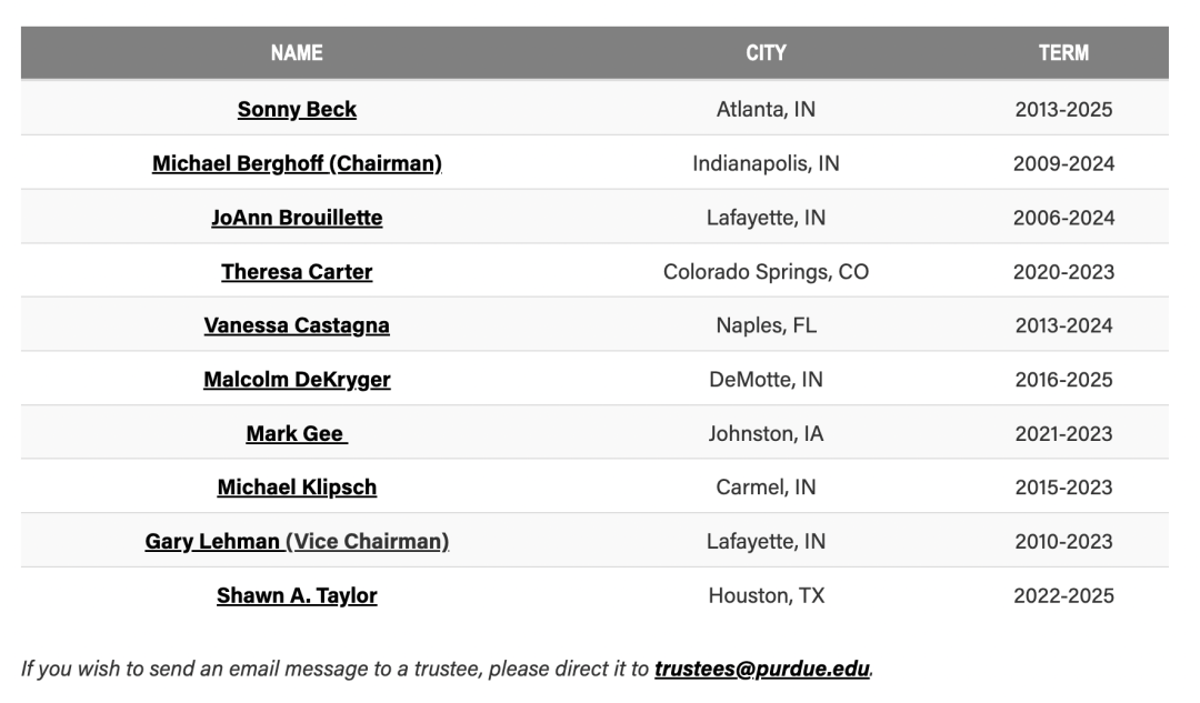 美国大学教授协会 (AAUP)也在16号发表声明,指出:“在一个日益多元化的世界中,在一个人的成功取决于对不同文化背景的人尊重的世界中,现在是基恩校长主动辞职或者被普渡大学董事会罢免的时候了”。 同时,学校内部的教职员迅速行动。16日,该大学的教务参议会(faculty senate)执行委员会在讨论后一致决定,要求科恩辞职。该执行委员会当天给校长发了一封公开信,要求他立即辞去校长职务。信中指出:“(1)他在2022年12月10日星期六毕业典礼上的冒犯性言论侮辱了亚裔美国人和太平洋岛民社区,包括普渡西北分校的教职员工和学生;(2)他不可原谅的行为引起了国内和国际的愤怒;(3)他的行为没有代表反普渡大学教职员工的多样性和包容的价值观” (AAUP Purdue chapter, 2022, Dec. 17)。吊诡的是,这些言论没有能否撼动科恩的地位。该校的教务参议会执行委员会主席托马斯·罗奇 (Thomas Roach)在多个场合接受采访时表示会继续施压,直到科恩辞职。但是,科恩仍然稳坐钓鱼台。罗奇说:“只要他还在大学里,任何道歉都是没有意义的,他需要辞职或需要被免职” (Jones, 2022, Dec. 19)。 该校的教务参议会执行委员会给科恩发出最后通牒,要求他在周一(19日)必须辞职,否则将启动对他的不信任投票。12月19日(周一) ,当科恩办公室没有回应教职工和美国大学教授协会要求他辞职的呼吁时,罗奇启动了对科恩的不信任投票,他向该大学约 238名教职员工发送了匿名选票,要求他们在12月20 日晚上11点截止时间前投票。结果显示,共有155名教职工投票,87% (135人)对科恩的领导能力投下了不信任票,只有13% (20人)投了信任票。AAUP普渡西北分会主席大卫·戴特默(David Detmer) 表示,投票具有决定性意义:“当 87% 的人投票表示不信任时,这对校长来说是一个难以为继的局面……当教师之间存在这种程度的不信任时,你就不可能继续担任大学领导” (Thorp, 2022, Dec. 21)。尽管国内、国际媒体都报道了这一事件,但是科恩还是没有辞职的迹象。教职工的投票只是公开给科恩校长增加了压力,但是并不能强迫他辞职。如果他不主动辞职,只有大学的董事会(Board of Trustees)可以强迫他下台。公立大学的董事会成员一般是由州长指定或者校友选举出来的。从普渡大学的10名董事会成员信息来看,10名成员都是被任命的:9名为白人。普渡大学的10名董事会成员,来源:https://www.purdue.edu/bot/about/trustees/trustee-bios/index.php