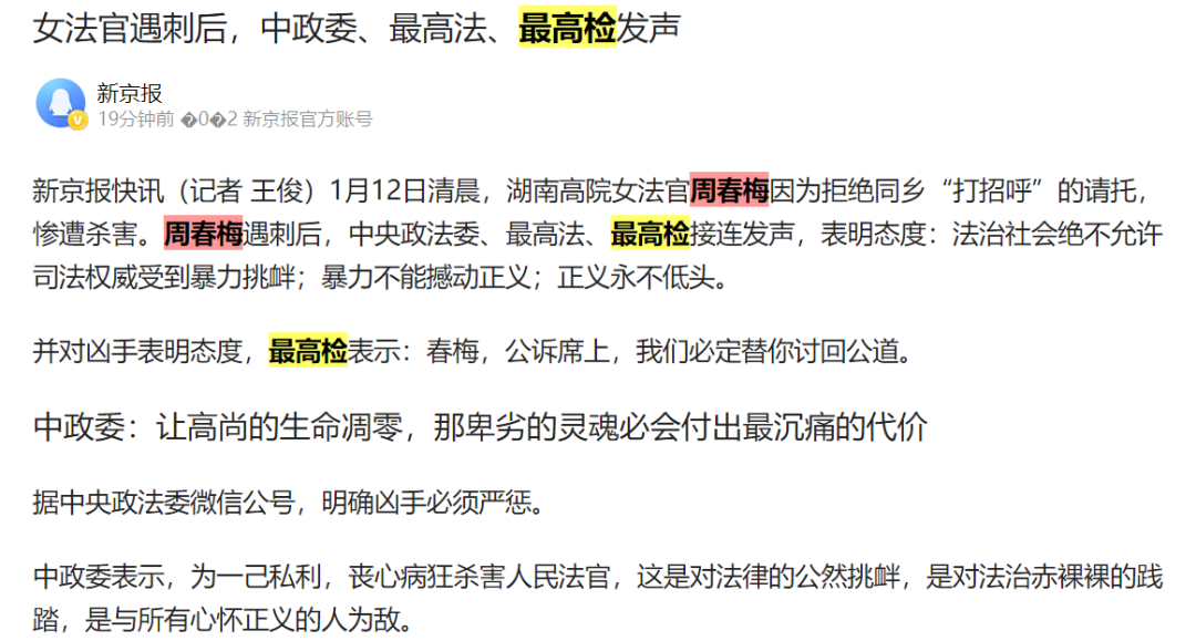 为此,就特别要警惕,权力部门的定调定性,会不会太迫不及待了。人们需要都看得见的结果正义,更需要看得见的程序正义。那么,这一次,在真相之前,程序正义和专业主义,会不会被各种权力的震怒给吓退了呢?公号“呦呦鹿鸣”昨天发了一篇题为《最高法的朋友,这次不妨走慢些》,认为相关司法部门的公共表达,太“紧凑”了。到底有多快呢?事发当日下午17:35,长沙市公安局天心分局就发布《警情通报》:警方通报两个半小时之后,湖南省高院发布《关于周春梅法官不徇私情、拒绝人情干扰 惨遭报复杀害情况的通报》:湖南高院通报之后不到一个小时,最高人民法院发布两篇官方微信公号文章,评价此事。这一切,足见这起杀人事件影响之力,损伤司法权威,也伤害司法界尊严。从新闻专业主义角度,从信息核实到写作完成,从审核批复到平台发放,不得不说,这些平台完成这些工作,真得有最牛逼的写作高手和最有效的编审机制。我就写这样一条稿件,还折腾了两天,生怕有一处细节不理性!我也不是嫉妒这种“快速度”,只是联想到一些司法拖拉、怠政与麻木的现象,觉得有些不爽。比如,“王振华案”的正义就迟迟没来,这些部门如果能以这样的激愤,来对这种人渣进行定调定性,早点让这厮受到正义审判,那该多好。周春梅是中国女人,王振华制造“13分钟永夜”伤害是中国女儿,谁的人身权利也容不得恶人伤害。回到此案,有些内容本身的定调与定性,需要经受专业主义的理性。离开公开事实与揭示真相,就无法形成完整的证据链条。说一万句周春梅是好法官,这都没问题。但是,眼睛只盯在周春梅一个人身上,肯定不足以成为对向慧杀人定性的完整依据。换句话说,就算向慧杀的是一个坏人,她也一样应该受到法律严厉审判。就算向慧是一个杀人犯,在未经审判前,她应有的权利也必须在法律框架下被尊重。这样集中震怒的权力,如果只是吓到那些挑战司法的人,倒也很好。但是,在具体执行中,会不会吓退专业主义,绕过程序正义,现在也有必要留个心。具体到这起命案中,对案件本身的司法定性,首先需要更为规范的陈述。即便是对一个杀人犯,在案件审判前,我们也只应称其为犯罪嫌疑人。法官在案件发生后,在未完成证据复核和审判流程下,保持应有的节制理性。这是讲究司法伦理的起码要求,也是满足程序正义的必须要求。不得不说,这起案件发生后,相关司法部门的公共表达,给人感觉过于情绪化,太急于定调定性了。退一步讲,如果只是普通公民,来表达这样的情感情绪,多少也可以理解。对司法部门来说,越是对本系统员工,越应该时候警惕自己不要先用司法舆论来影响审判。在这样的公共案件面前,在信息核对没有真正还原真相之前,在司法审判程序还没有正式启动之前,司法权力部门的发声,应该克制理性,严谨规范。