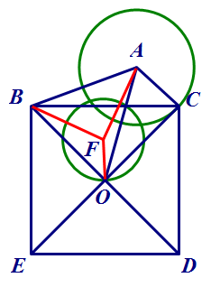 简析:先确定A、B点的位置,因AC=2,所以C点在以A为圆心,2为半径的圆上;因点O是点C以点B为中心顺时针旋转45度并1:√2缩小而得,所以把圆A旋转45度再1:√2缩小即得O点路径。如下图,转化为求定点A到定圆F的最长路径,即AF+FO=3√2。