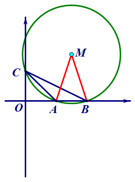 简析:作ΔABC的处接圆M,当∠ACB最大时,圆心角∠AMB最大,当圆M半径最小时∠AMB最大,即当圆M与y轴相切时∠ACB最大。