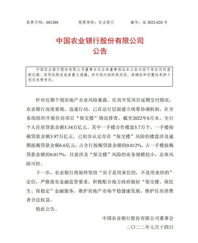 农业银行表示:“针对近期个别房地产企业风险暴露、住房开发项目延期交付情况,农业银行高度重视,迅速行动,已在总行层面建立统筹协调机制,在全系统组织开展住房项目‘保交楼’情况排查。”