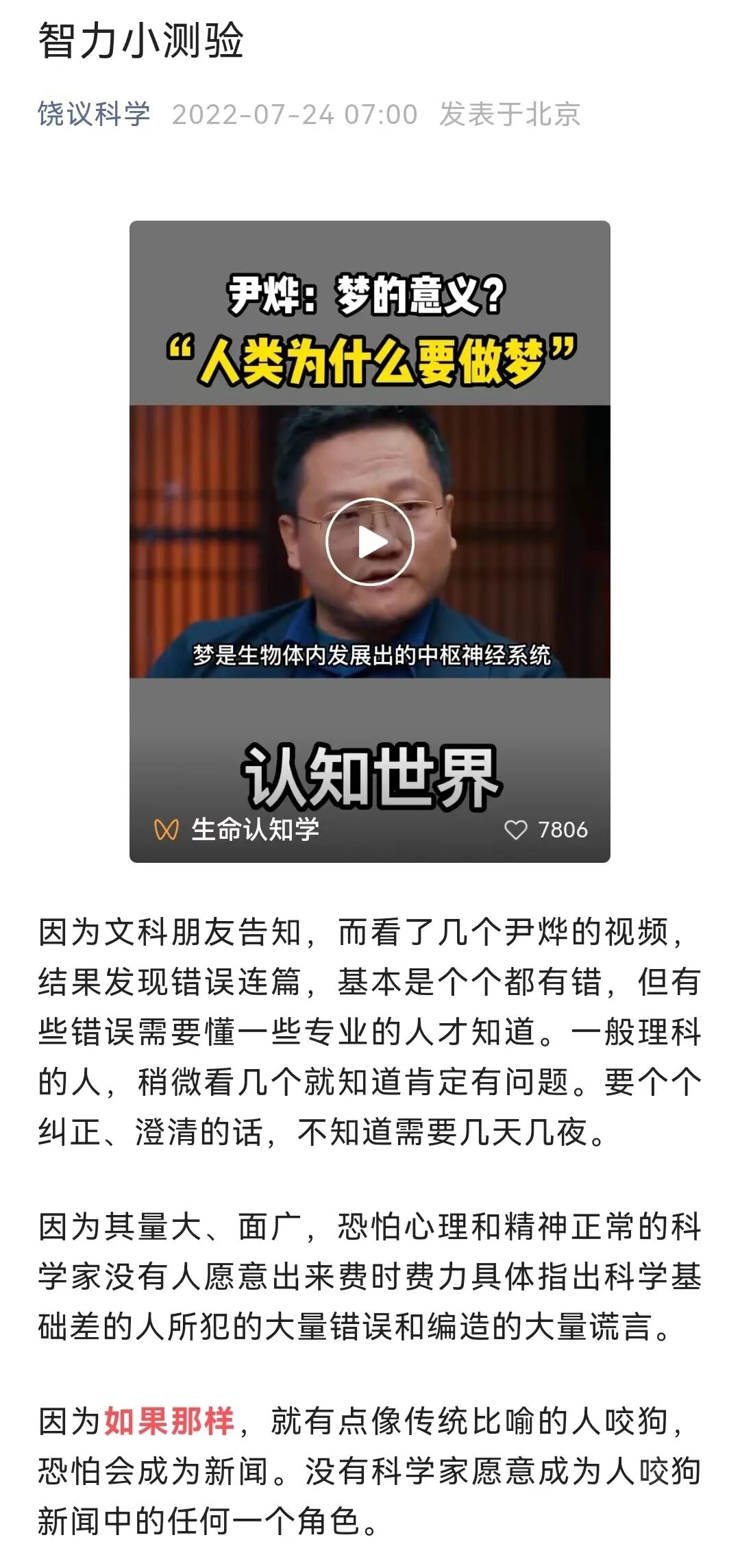 红星资本局注意到,《智力小测验》一文中插入了尹烨关于梦的意义及人类为什么要做梦的解说视频。视频中,尹烨称,“梦是生物体内发展出的中枢神经系统且升维成了大脑之后的特有的一种感知。”饶毅发文称,“看了几个尹烨的视频,结果发现错误连篇,基本是个个都有错,但有些错误需要懂一些专业的人才知道。一般理科的人,稍微看几个就知道肯定有问题。要个个纠正、澄清的话,不知道需要几天几夜。”