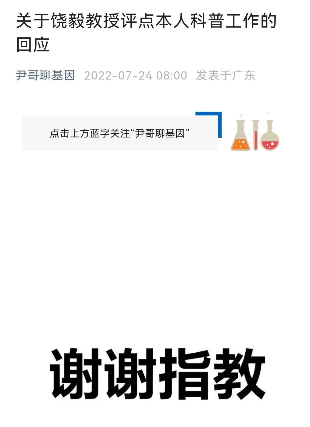 对此,今晨8时,尹烨在其公众号“尹哥聊基因”中回应饶毅的上述观点称,“谢谢指教”。