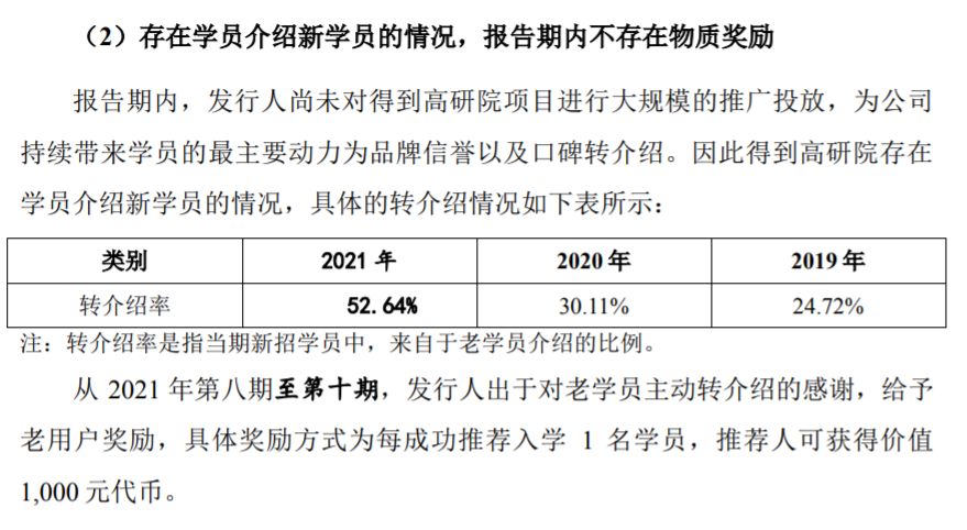 为了获取新用户,得到高研院项目一直鼓励老用户介绍新用户。2019-2021年,得到高研院转介绍率(新招学员中来自于老学员介绍的比例)分别为24.72%、30.11%、52.64%。
