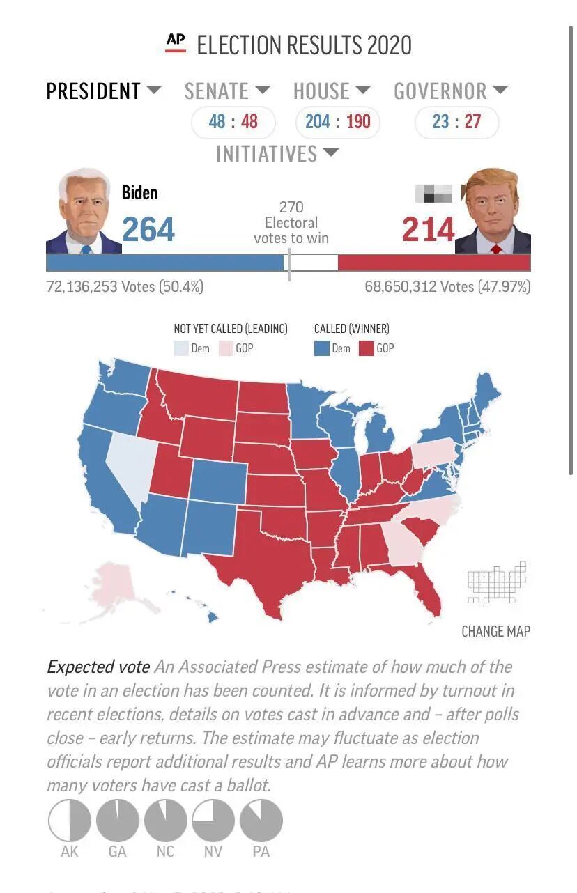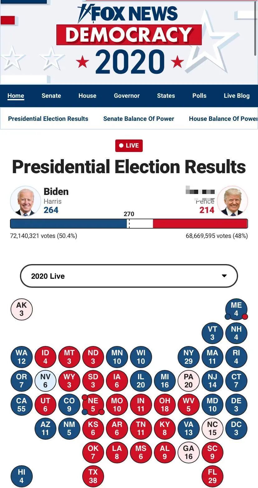 据说这样的处理方式惹怒了特朗普,因为福克斯电视台一向是共和党选民的最爱,是一个偏保守派的电视台。但在这一次大选,福克斯毫不吝啬地宣布拜登胜选的州,CNN 反而在大选当晚很久都没有决定维吉尼亚州的归属。