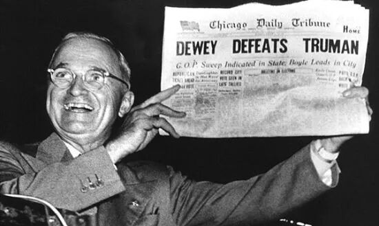 冯兆音:1948 年时,芝加哥有一家主流报纸提前印好头条,说当时其中一位候选人会胜选,但其实是杜鲁门胜选了。第二天,杜鲁门拿着报纸头条,上面写是他的对手胜选。这是当年很著名的一个新闻报道错误。