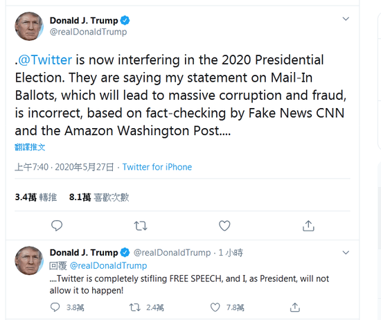 ● 特朗普反击 Twitter 将他发布的内容标记为「有误导性」