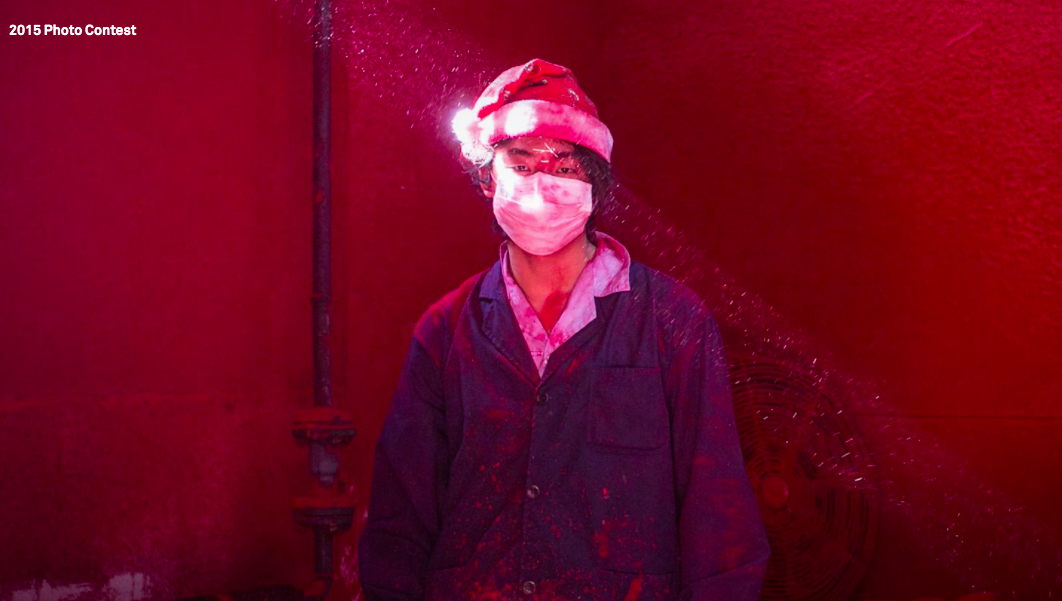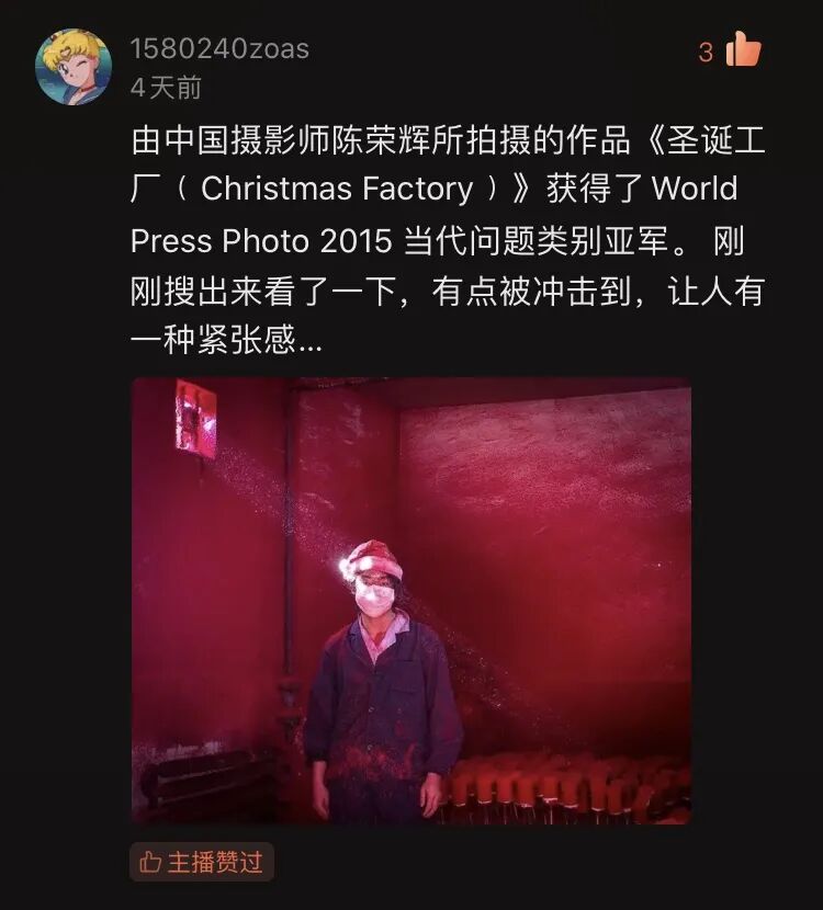 西方人在看到陈荣辉拍摄的「圣诞工厂」时或许也会有被背叛的感觉。浮着粉尘的「圣光」,一位戴口罩的、穿着工装的 19 岁蓝领青年,头顶着圣诞帽,没有表情,他甚至根本不关心耶稣的生日。在工厂,他的工作就是给雪花饰品涂上红色粉末。这是基督文明节庆背后,西方观众很少关心的中国工人故事。我们甚至可以想象他们脑海中思考着什么,图片中的青年是否正在「受难」,乃至更广泛意义上的劳工权利、世界工厂、第三世界.....