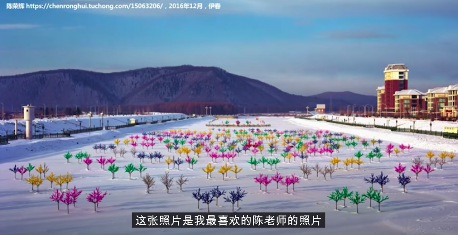 除了站在远处,陈荣辉也曾带着 4x5 的大画幅相机,站在梯子上看市民生活(「脱缰的世界」)。在常州的恐龙主题公园,逼真的恐龙雕塑出现在高楼之前;或是在东北小城伊春,空旷雪地上插着五颜六色的彩灯(「空城计」)。这些都是更为私人的艺术摄影创作。尽管「空城计」在某种意义上与公共项目有关——清华大学建筑学院的龙瀛教授在人口外流的「收缩城市」做实地考察,作为合作摄影师,陈荣辉需要记录下此地人的生活状态。比起新闻稿,这依然更像是个艺术命题。